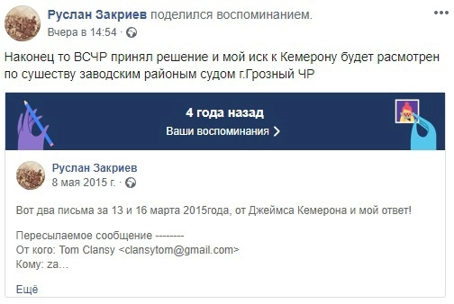 Чеченский писатель Руслан Закриев, который несколько лет назад обвинил режиссера культового фантастического фильма «Аватар» Джеймса Кэмерона в плагиате, сообщил, что его иск будет рассмотрен по существу.