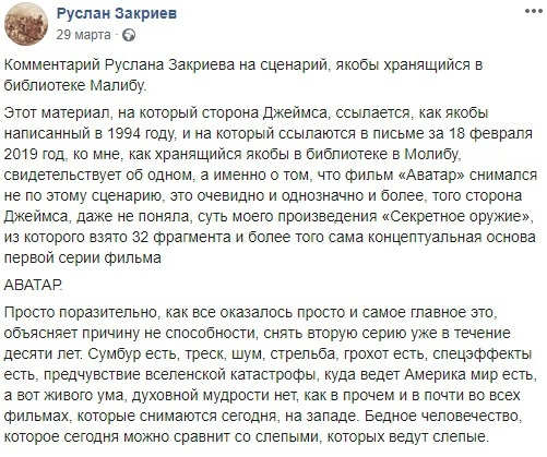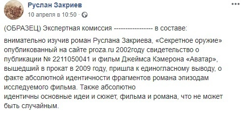 «Внимательно изучив роман Руслана Закриева „Тотальная война. Секретное оружие“, опубликованный на сайте Proza.ru в 2002 году, свидетельство о публикации N2211050041, и фильм Джеймса Кэмерона „Аватар“, вышедший в прокат в 2009 году, экспертная комиссия пришла к единогласному выводу факта абсолютной идентичности фрагментов романа с эпизодами исследуемого фильма. Также абсолютно идентичны идеи и сюжеты как фильма, так и романа, что не может быть случайным», — приводит текст заключения писатель.