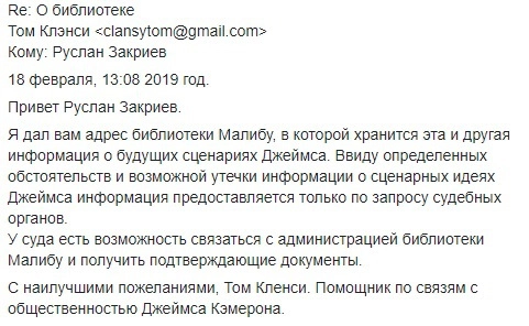 В феврале этого года в очередном письме Том Клэнси подчеркнул, что «Джеймс Кэмерон написал свой сценарий для „Аватара“ в 1994-м году». «Доказательство этого факта есть. И они неоспоримы. Вы или ваши адвокаты можете ознакомиться с документами в главной библиотеке Малибу, которые заверены юристами и нотариусами в 1994 году, и подтверждают факт соответствия сценарию 1994 года и фильму „Аватар“», — приводит текст письма Закриев.