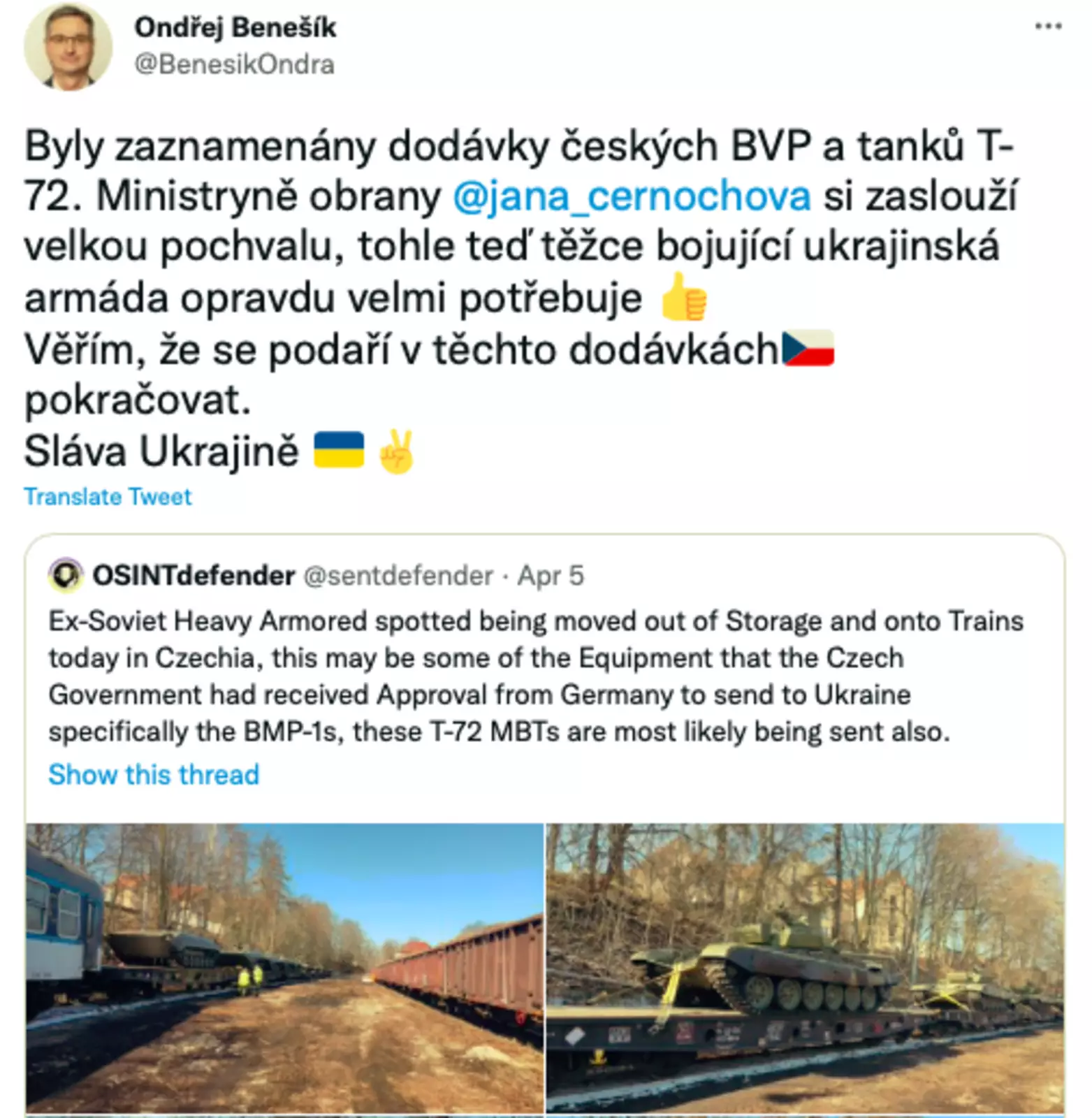 По информации редакции, на прошлой неделе на территории Чехии уже были замечены перемещения мобильных зенитных комплексов «Стрела-10». Хотя поставка тяжелой техники должна была храниться в строгом секрете, во вторник утром председатель Палаты депутатов по европейским делам Ондржей Бенешик (KDU-ČSL) выступил публично по этому вопросу.