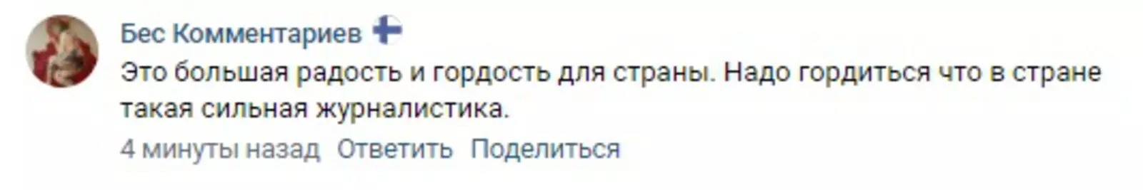 Пресс-секретарь президента России Дмитрий Песков сообщил, что руководство страны поздравляет главреда «Новой» с престижной международной премией. Сам он дал Муратову положительную оценку: «Он последовательно работает по своим идеалам и привержен им, талантлив и смел».