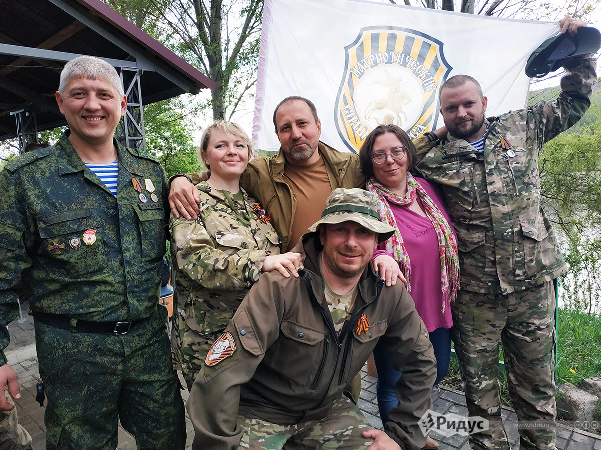 На фоне флага общественного объединения; бойцы Фил, Сергей Сергеевич, начмед Оля, в центре Ходаковский© Наталия Курчатова/Ridus.ru