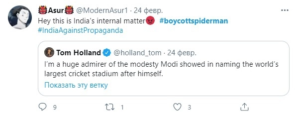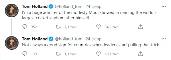 Такую ярость индийцев вызвал пост в Twitter от 24 февраля, подписанный «Том Холланд». Его автор опубликовал ядовитую шутку в адрес премьер-министра Индии Нарендры Моди, в честь которого ранее переименовали крупнейший в мире стадион для крикета в городе Ахмадабад.