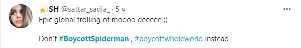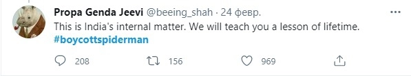 Сторонники Нарендры Моди были вне себя и решили, что автор твита и исполнитель роли супергероя из вселенной Marvel — один и тот же человек. Как сообщает Vice, в индийском сегменте соцсети «Спайдермена» обвинили во вмешательстве во внутренние дела Индии и даже в участии в заговоре против Моди, которого актер якобы согласился высмеивать за деньги. В Twitter распространился хэштег #BoycottSpiderman.