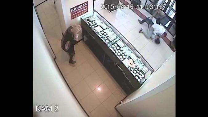 Накануне в Сети появилась видеозапись, на которой запечатлен налет на ювелирный магазин. На записи видно, как посетитель салона ударом ноги укладывает налетчика на пол. Лежащий преступник начинает трястись, после чего молодой человек оказывает ему помощь.