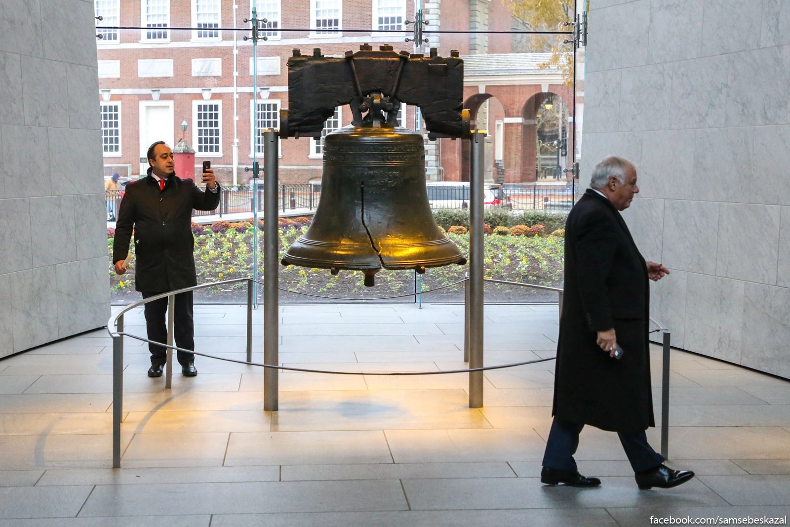 Это одна из главных достопримечательностей города — Колокол Свободы. На входе в павильон, где он висит, меня обыскали так тщательно, будто в чем-то подозревали :) Оказалось, причина не моя хмурая рожа, а вот этот дядечка справа, который был со специальным сопровождающим и двумя вооруженными охранниками. Кто он такой, я не знаю.
