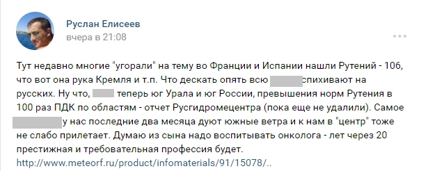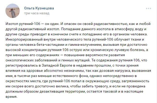 «Французское агентство по радиологической защите заявило, что превышение концентрации рутения возможно и это может быть связано с инцидентом или в России, или в Казахстане. По их словам, это явно не авария на атомной станции, это может быть инцидент, связанный с предприятием по хранению и переработке топлива. Второй вариант — это может быть связано с медицинскими источниками излучения, то бишь с какими-то устройствами или установками, которые применяются для радиоизотопной диагностики или лучевой терапии. Но еще раз повторюсь — или в России, или в Казахстане. Никто точно не сказал, где произошел этот инцидент и произошел ли он вообще», — заключил собеседник «Ридуса».