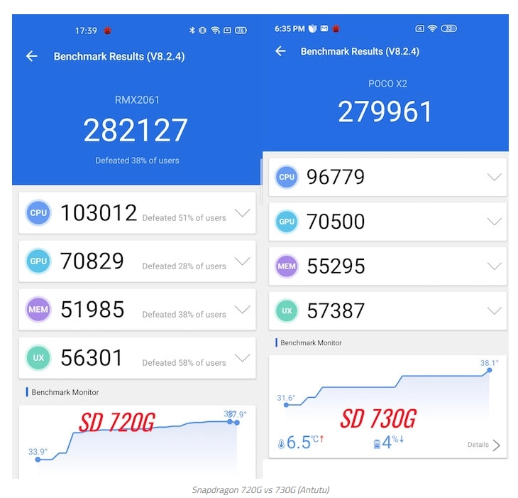 В бенчмарке Antutu Snapdragon 720G набрал 282127 баллов, а Snapdragon 730G 279961 балл. Разницу в результатах можно списать на погрешность, поэтому можно смело сказать, что процессоры одинаковы по производительности. Хотя старшая модель имеет два производительных ядра Kryo 470, а младшая два ядра Kryo 465, но это не дает никакой разницы. Плюс Snapdragon 730G способен поддерживать разрешение дисплеев вплоть до QHD+, которым могут похвастаться даже не все флагманы, не говоря уже о смартфонах среднего сегмента.