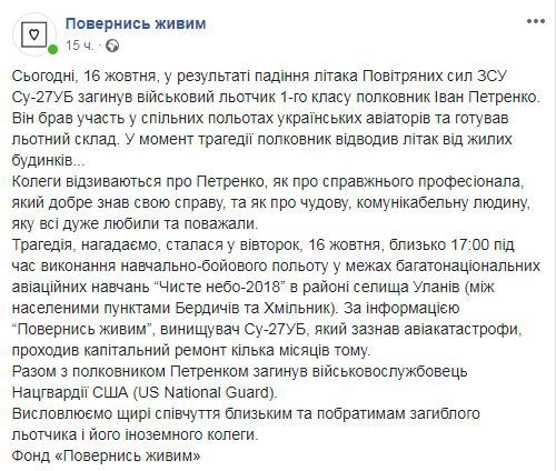 Иван Николаевич Петренко погиб в ходе учений «Чистое небо», которые проходили совместно с военными НАТО. Пресс-служба Генштаба ВСУ в Facebook сначала сообщала, что один из погибших пилотов — представитель Военно-воздушных сил Национальной гвардии США, но позднее убрала упоминания о гражданстве. В командовании ВВС США подтвердили «участие в инциденте» гражданина США.