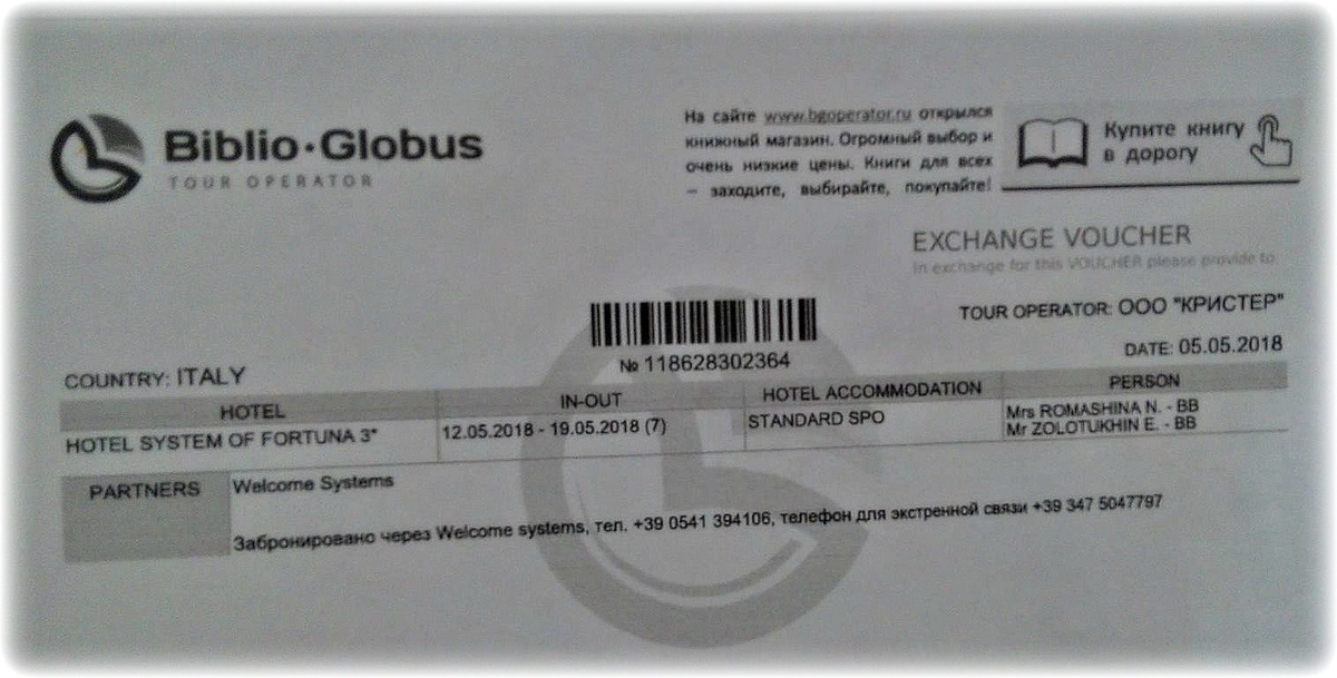 Ранее Наталья прислала «Ридусу» снимок ваучера, по которому она поехала в Италию.