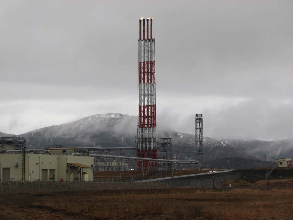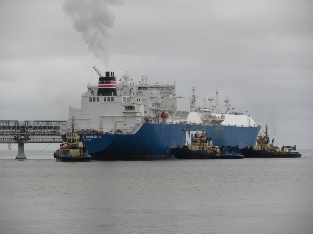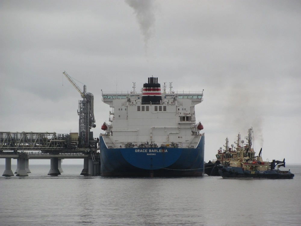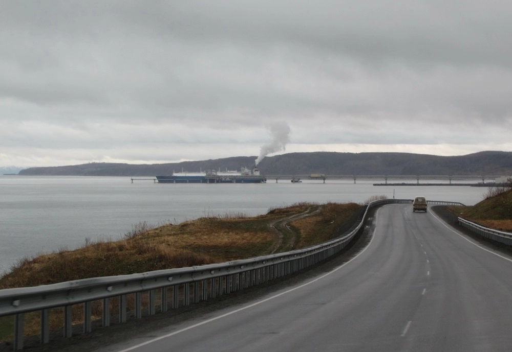 Едва выбравшись с грунтовки на автобан и взглянув с пригорка на «Пригородное», мы увидели, что у терминала газоперерабатывающего завода заканчивал швартовку газовоз «Grace Barleria». Терминал в действии!