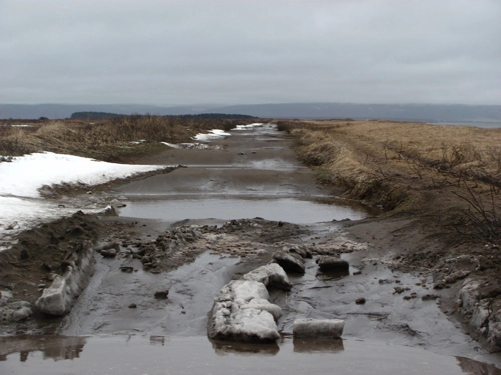 А затем начинается самое интересное — сворачиваем с трассы и начинаем 15 километровый путь по бездорожью песчаной косы. Кажется, что в этих лужах на нашей «Тойоте» с шашечками не увязнуть ну просто невозможно — однако, несмотря на низкую посадку, машина уверенно проходит все преграды, в наиболее глубоких лужах порой напоминая амфибию. Впрочем, тут песчаник, а не глина — по нему ехать проще. Ну и мужик-водила конечно знает свое дело — сразу видно: свой, бывалый человек… А его рассказы про Сахалин — так это вообще просто заслушаться!