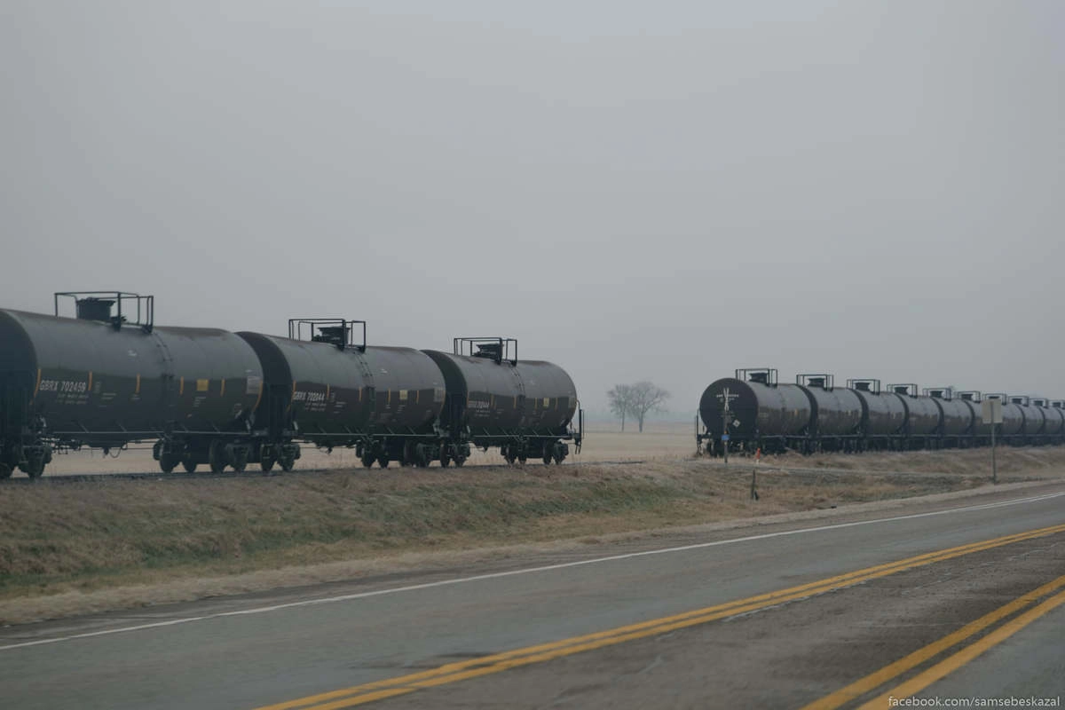 Разрыв между бесконечными вагонами стоящими вдоль дороги.