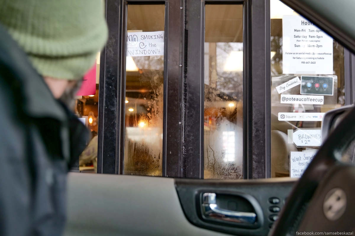 На окне драйв-тру «хипстерской» кофейни объявление с просьбой не курить им в окно.