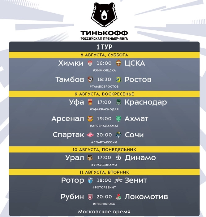Полную таблицу матчей первого тура, который завершится 11 августа, пресс-служба РПЛ выложила в Twitter.