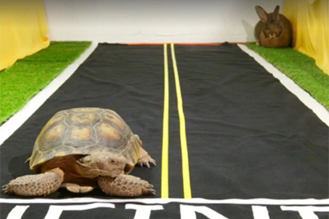 Черепаха и заяц сразились в забеге, который транслировался в прямом эфире в Facebook на странице медиакомпании. Поединок выдался на редкость напряжённым, длился чуть более 40 минут, и черепахе удалось всё-таки вырвать победу. На самом деле, всё произошло почти как в известной басне. Заяц хоть и не лёг спать на финише, уверенный в своих силах, но предпочёл забиться в угол и вообще не двигаться. То ли был напуган ажиотажем вокруг него, то ли всё уже всем доказал и без ваших этих конкурсов. Черепаха же очень медленно, но очень упорно шла к финишу и прямо перед ним ещё давала последний шанс зайцу, долго не пересекая победную черту.