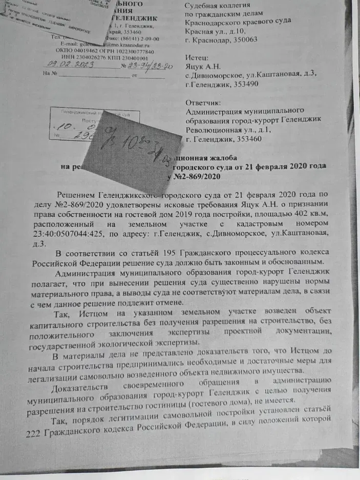 «В 2023 году администрация Геленджика решила все подобные решения отменить и искала предлог для восстановления срока на обжалования, который составляет месяц, а прошло ведь три года. Тогда по делу 2020 года чиновники придумали, что якобы администрация не получила в тот момент решение суда, поэтому не могла обжаловать. Это ложь, так как в суде имеется журнал, в котором представитель администрации расписывается за полученные решения, и решение Алексея Яцука представители властей получили. Оснований для восстановления срока на обжалование не было, но Геленджикский суд срок восстановил и ничем не мотивировал. Краснодарский суд в ответ нашу жалобу поддержал восстановление срока, при этом намеренно не рассмотрел доказательства получения администрацией Геленджика в мае 2020 года решения суда. Это несмотря на то, что мы представили копию журнала получения решений, заверенную самим судом. Затем Краснодарский суд назначил рассмотрение апелляционной жалобы, чтобы отменить решение суда о признании собственности на гостевой дом, и 3 августа 2023 года принял сторону администрации, не учитывая аргументов Яцука, не дав Яцуку обжаловать в кассационный суд свое решение о продлении строка на обжалование для Администрации, намеренно не рассмотрев аргумент, что Яцук опроверг доказательствами все доводы апелляционной жалобы Администрации», — перечисляет этапы судебного разбирательства юрист Елена Растиславская.