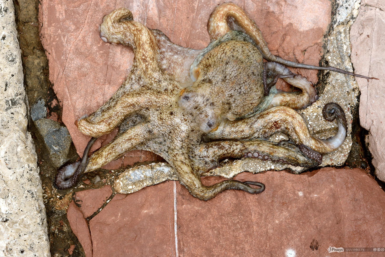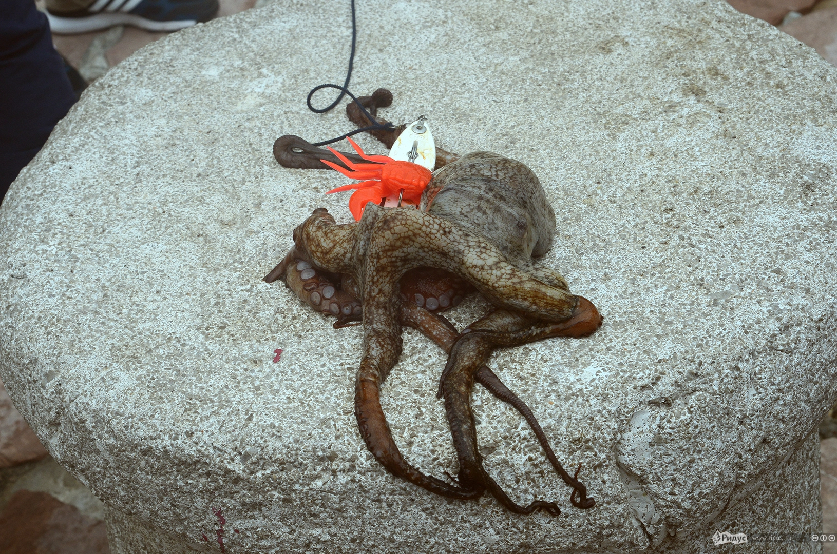 Рыбак рассказал о способе ловли: на крючок вешается яркая пластиковая приманка в виде краба, и когда осьминог пытается захватить добычу всеми своими восемью щупальцами – попадается на крючок. Далеко за ними ходить не надо – осьминоги приплывают прям к пирсу.