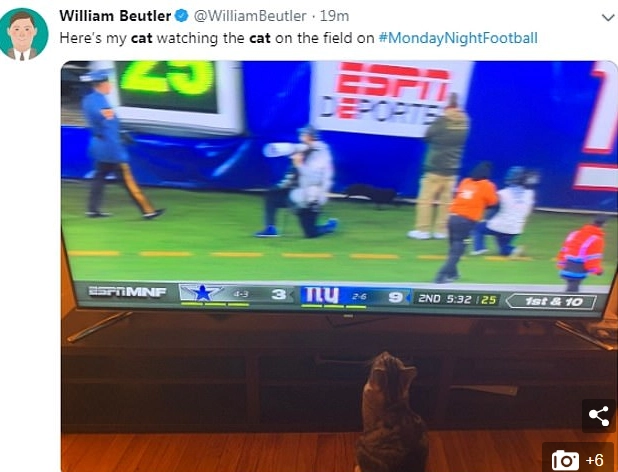 Кот выскочил на поле во второй четверти игры, прервав натиск «Джайнтс» на ворота противника. Арбитр Клей Мартин вынужден был объявить перерыв. Сотрудники стадиона и Национальная гвардия штата попытались удалить животное с поля, но усатый любитель футбола упорно не давался им в руки.