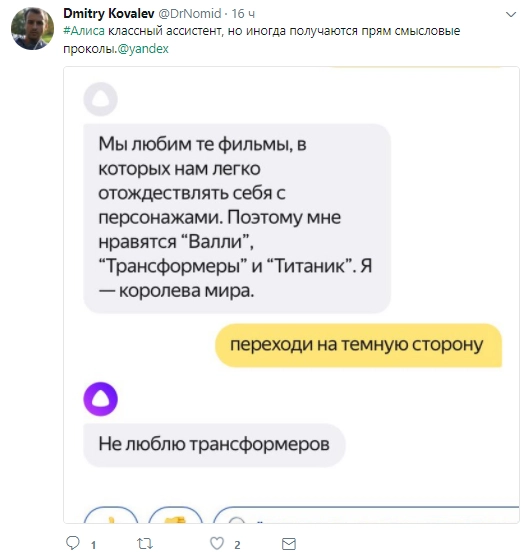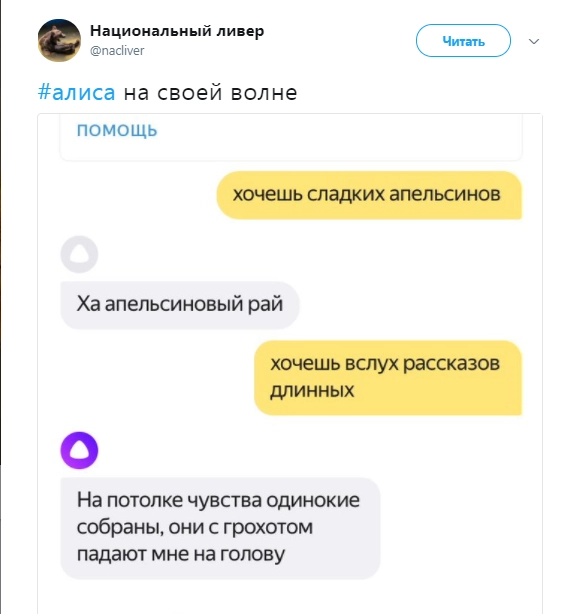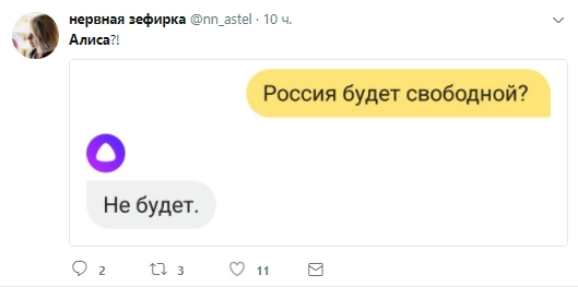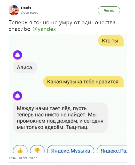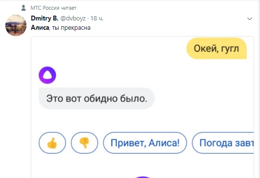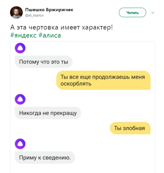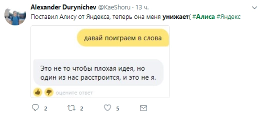 «Поставил „Алису“ от „Яндекса“, теперь она меня унижает», — в шутку жалуется один из пользователей.