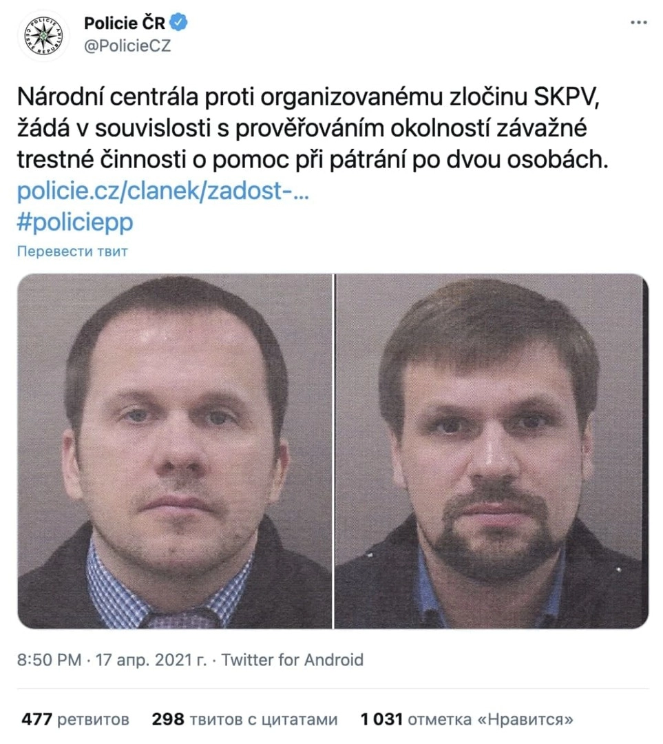 Как сообщается в Twitter чешской полиции, указанных россиян разыскивают в связи с расследованием «обстоятельств серьезного преступления».