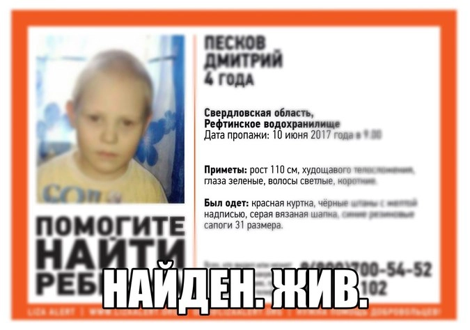 На пятые сутки поисков заблудившегося в лесу четырехлетнего Димы Пескова усилия спасателей увенчались успехом: мальчик найден живым. По данным группы «Поисковый отряд „Лиза Алерт“ Екатеринбург», ребенок был около болота, возле которого накануне вечером поисковики обнаружили его следы. Это место находится в семи километрах от места пропажи мальчика.