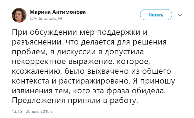 Министр социально-демографической и семейной политики Самарской области Марина Антимонова извинилась за совет матерям-одиночкам создавать полные семьи и разводить огород. Чиновница заявила в Twitter, что ее слова были вырваны из контекста.