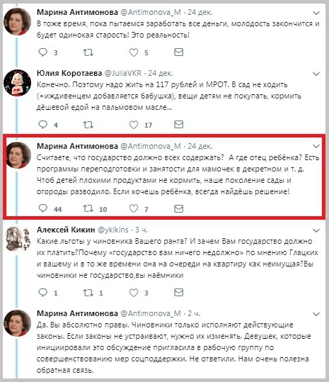 24 декабря Антимонова поделилась в соцсетях статьей о катастрофической демографической ситуации в регионе под заголовком «Нужно больше рожать: население Самарской области сократилось на 7400 человек». Одна из женщин, находящихся в декретном отпуске, заметила в комментариях, что пособие на ребенка старше полутора лет составляет 50 рублей в месяц.