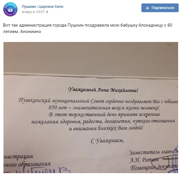 На свой 80-летний юбилей блокадница получила от муниципалитета Пушкинского района Ленинградской области поздравительную открытку, в которой местные чиновники поздравили пенсионерку «с 850-летием».