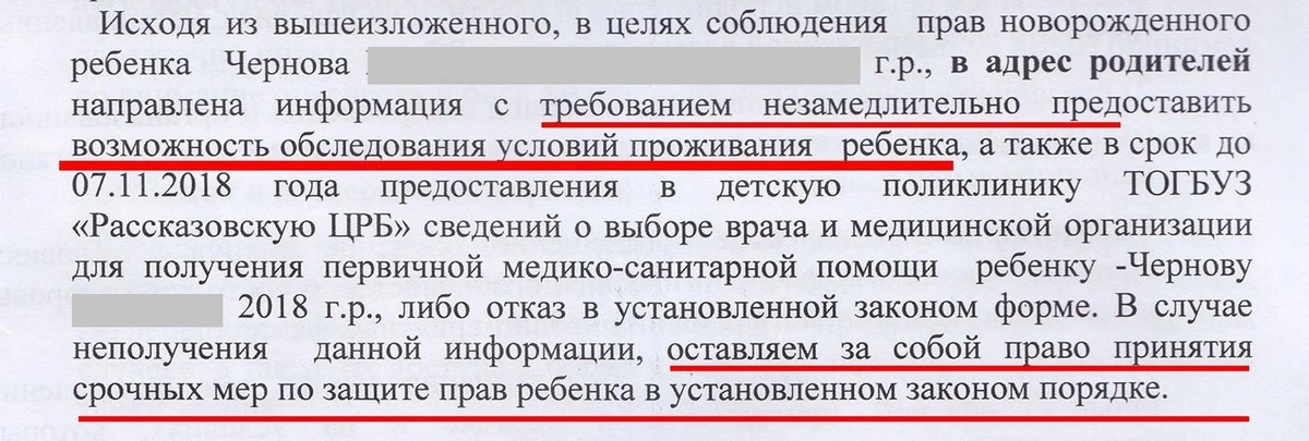 Через несколько дней супругам пришло письмо, в котором органы опеки требовали немедленно разрешить им обследовать условия проживания ребенка, и пригрозили «срочными мерами по защите прав ребенка». Чернов говорит, что в заявлении администрации речь шла об изъятии малыша из семьи.