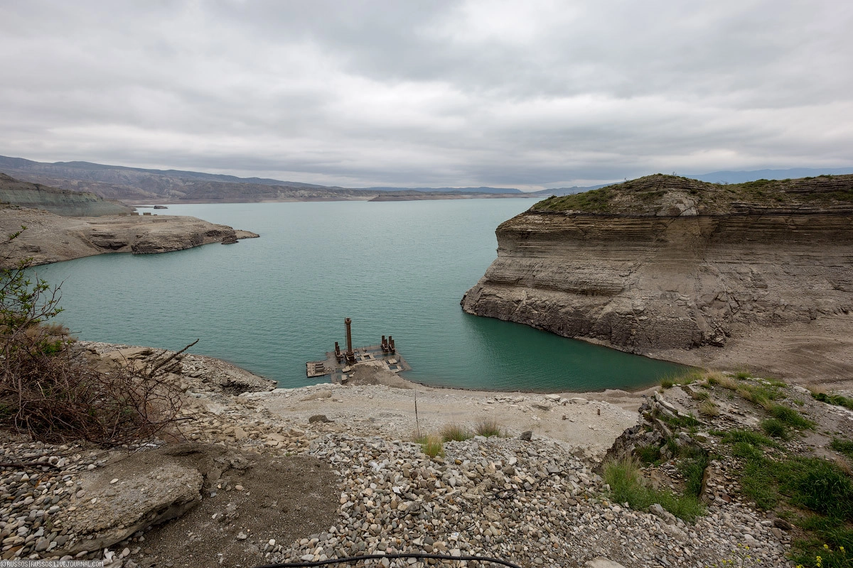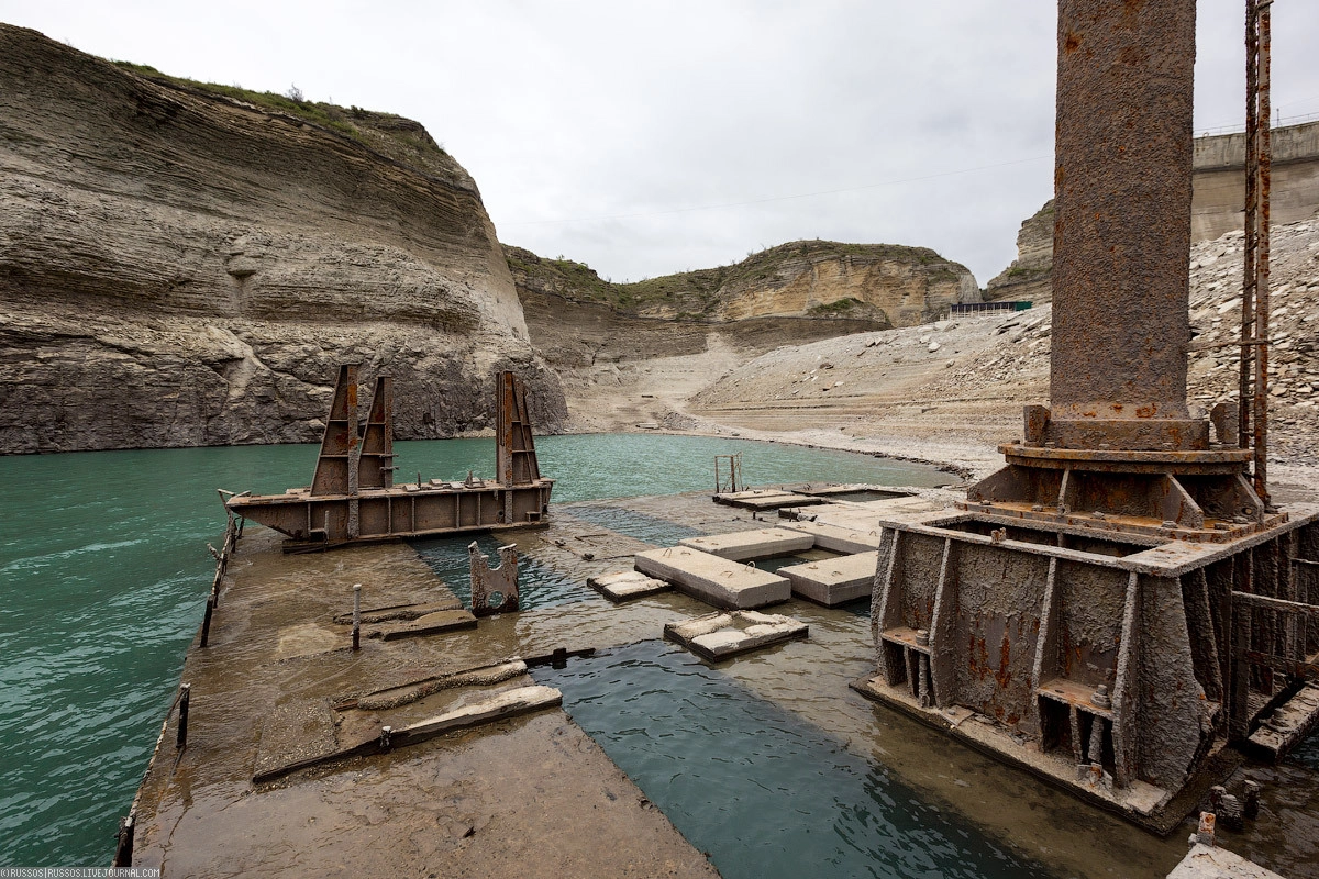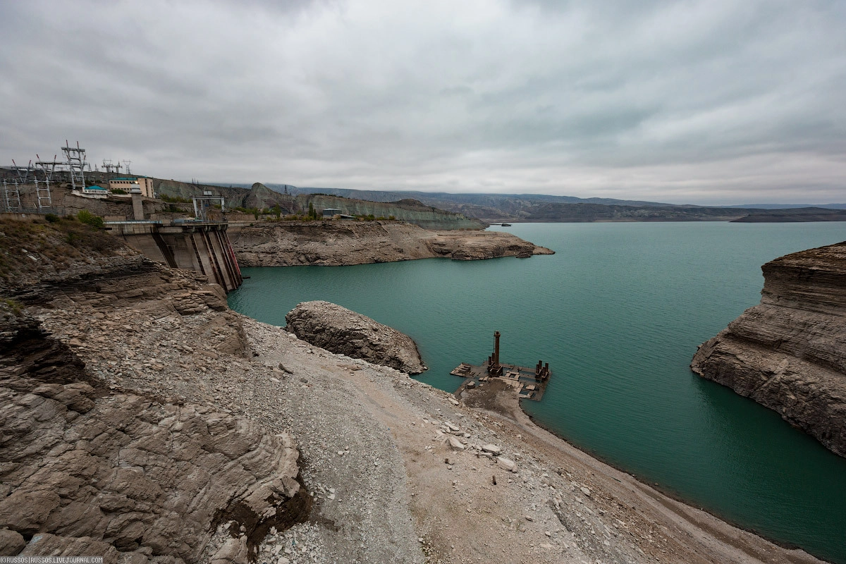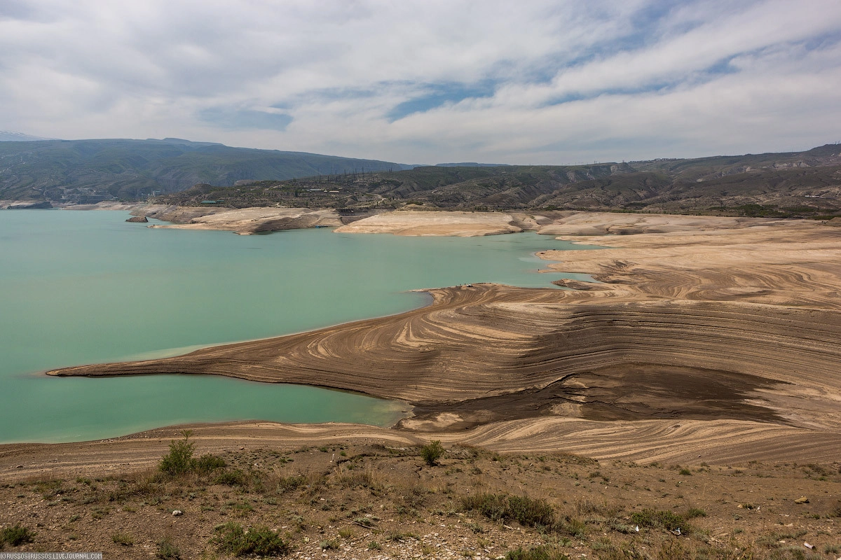 Можно увидеть, насколько ушла вода, обнажив дно водохранилище. Кстати, река Сулак несёт большое количество наносов — 21,4 млн т в год.