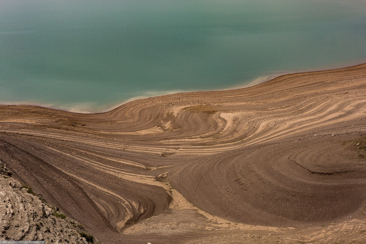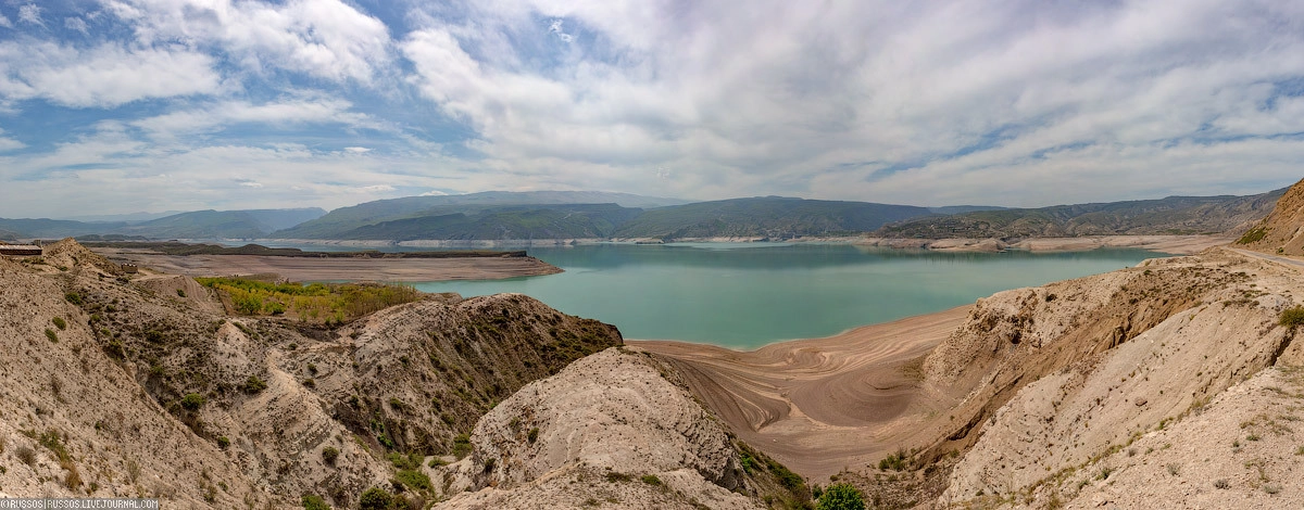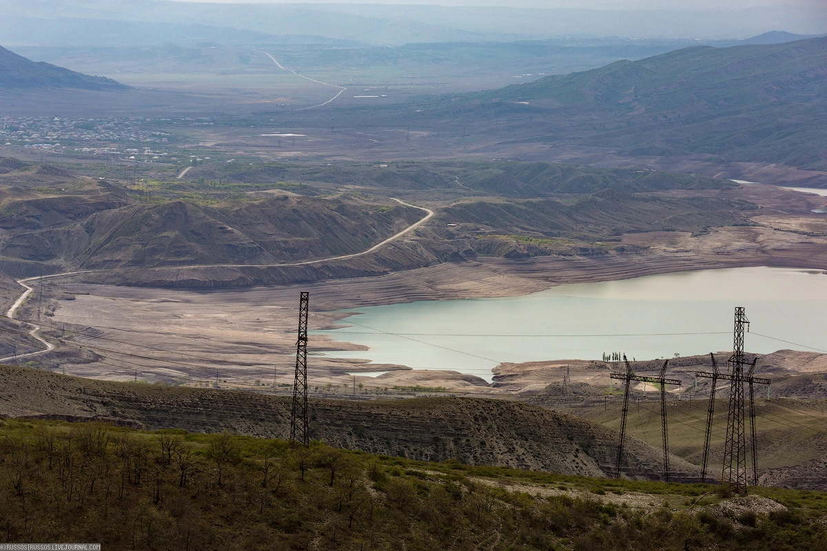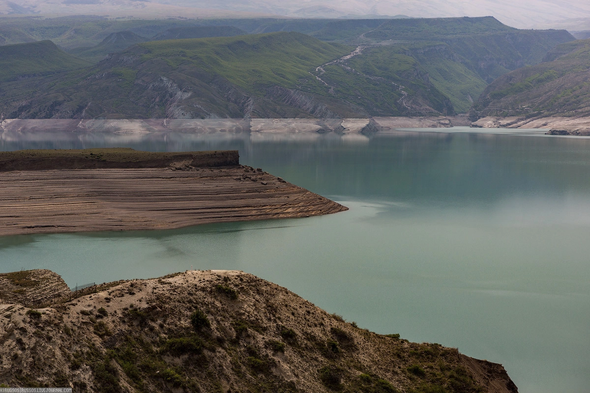 Можно увидеть, насколько ушла вода, обнажив дно водохранилище. Кстати, река Сулак несёт большое количество наносов — 21,4 млн т в год.