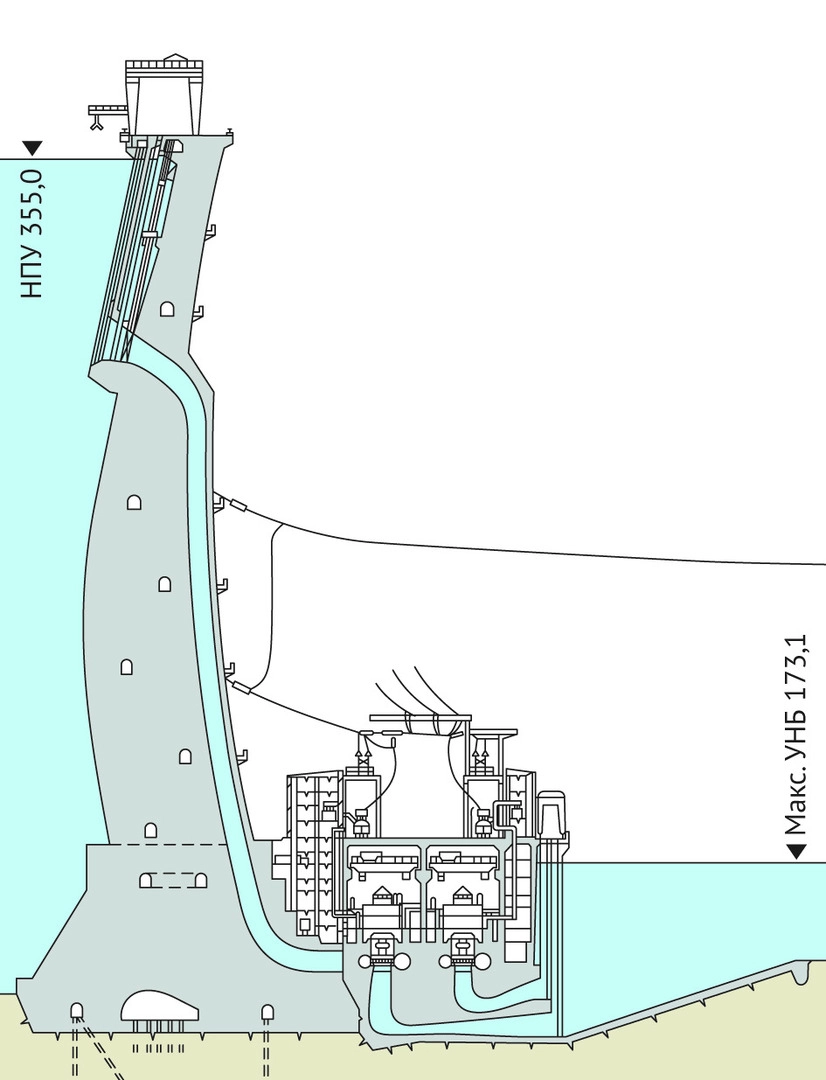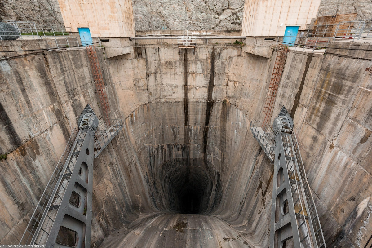 Портал тоннеля, через который осуществлялся пропуск реки на период строительства. Его можно увидеть из-за низкого уровня воды в нижнем бьефе.