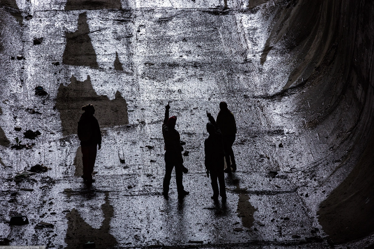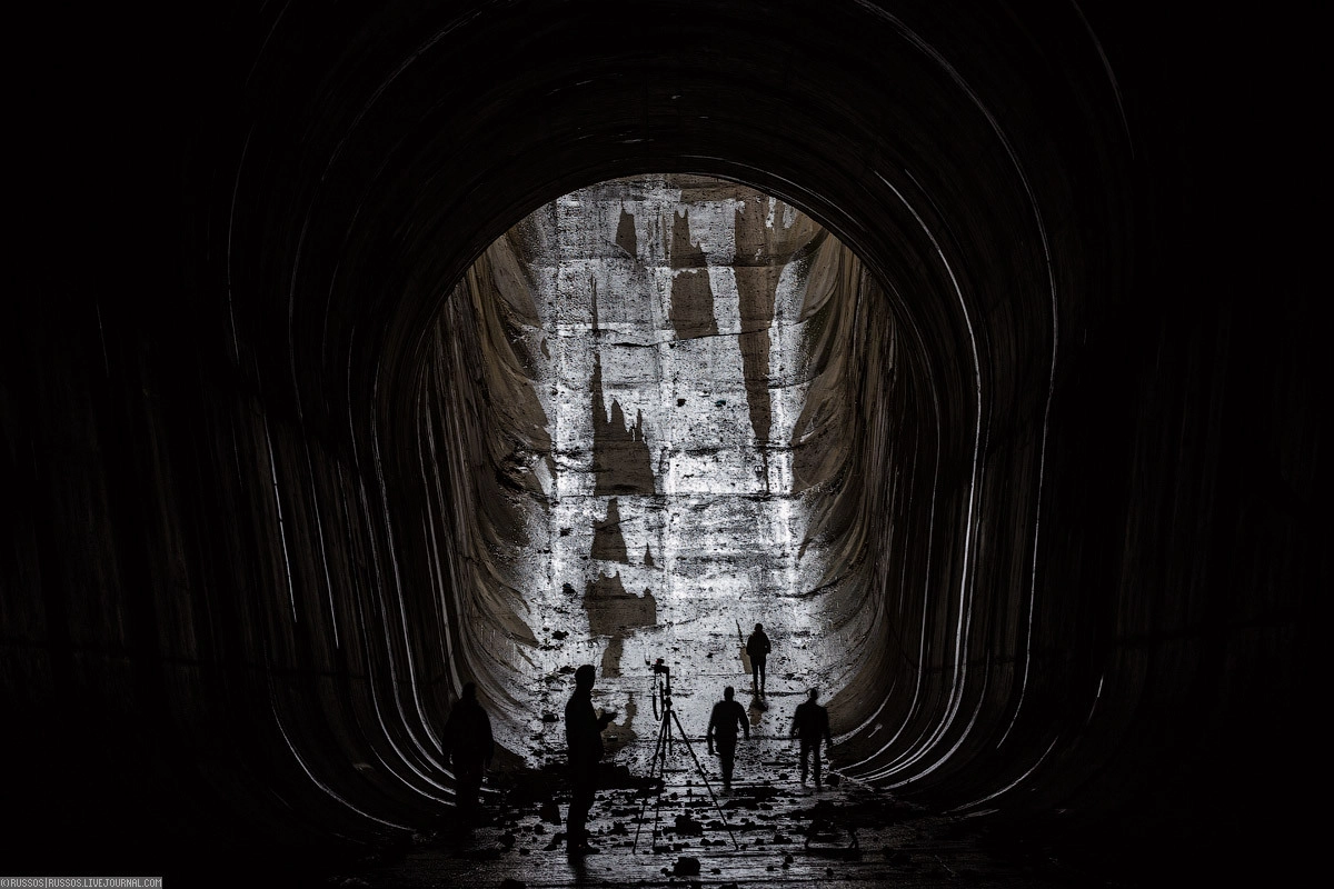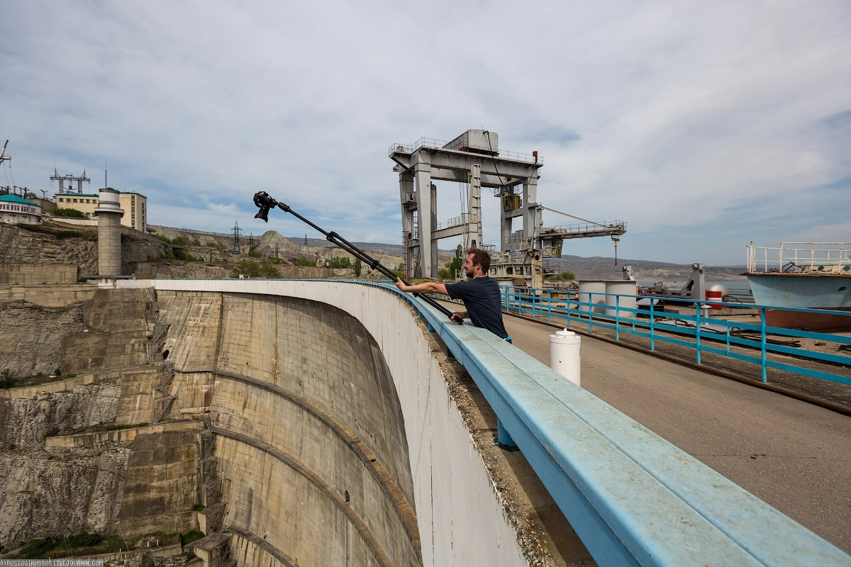 Мы обсуждаем план съемок. Так как уровень воды в водохранилище понизился почти до минимальной отметки и находится ниже порога водосброса, то в нем гарантировано не может быть воды. Следовательно, в него можно войти.