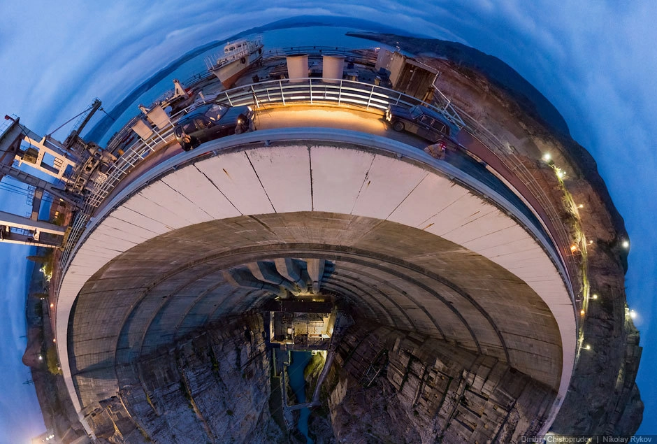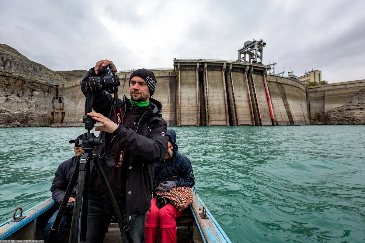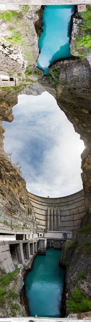 Эти две панорамы обрабатывались в разное время, поэтому они разные. Но обе по своему хороши. Да, цвет воды там такой на самом деле! Вода с гор несет много примесей, которые оседают на дно водохранилища. И в нижней бьефе мы можем видеть воду нежнейшего бирюзового цвета.