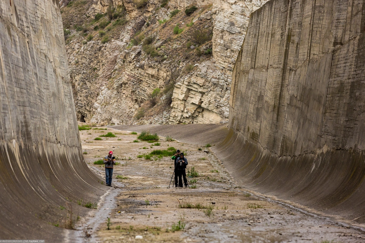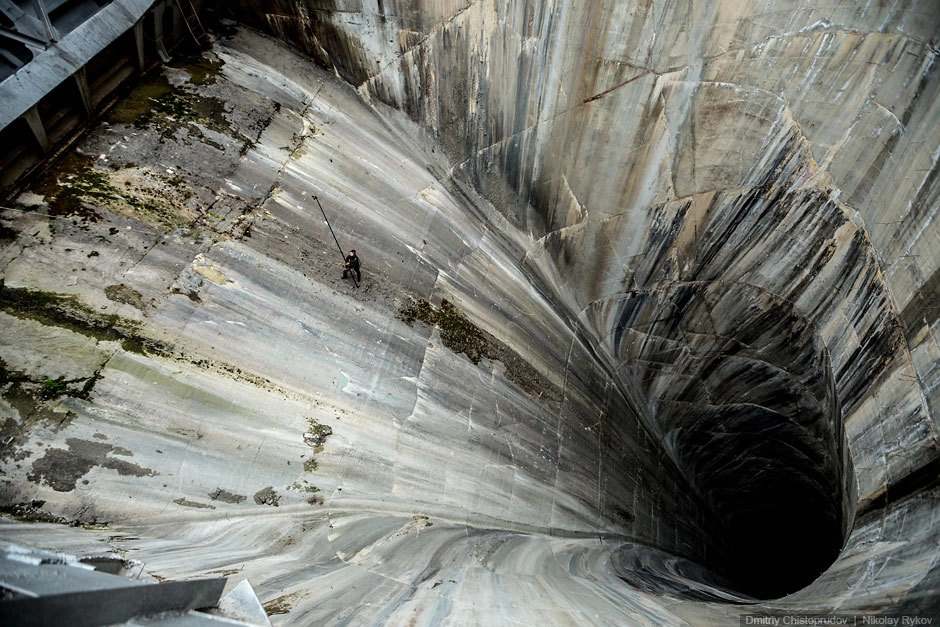 Слабонаклонная часть водосброса длиной 350 м и высотой 12,6 метра. Если присмотреться, то можно найти человека на фото.