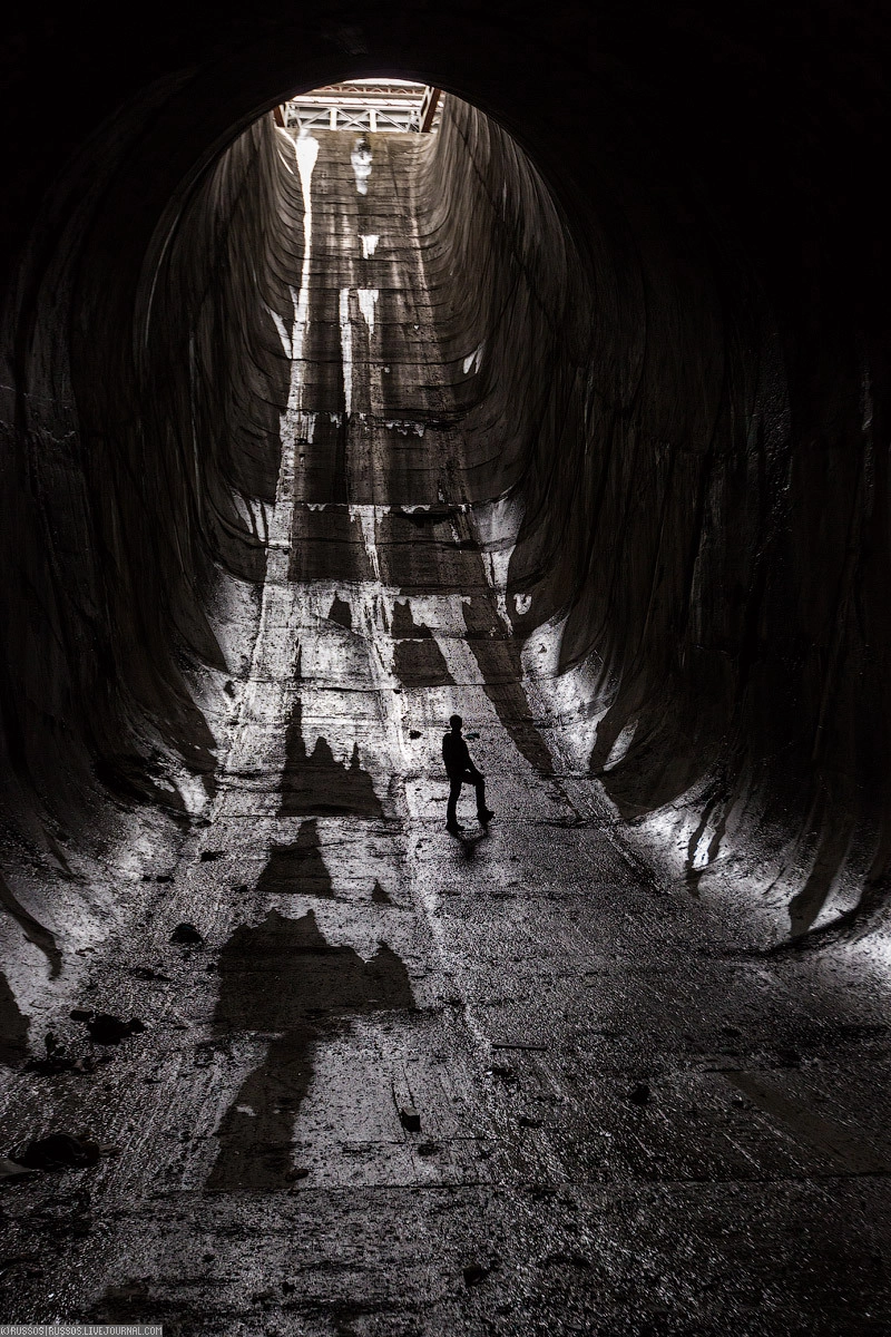 Скорость воды, вернее, водовоздушной смеси в подземном тоннеле достигает 55 метров в секунду.