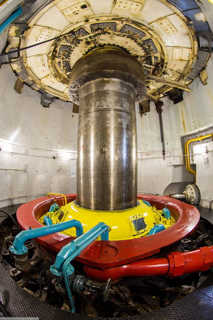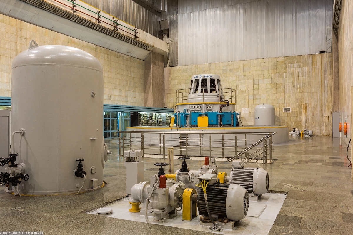 В машинный зал зашли, но быстро. В прошлый раз тут все сняли и в спиральную камеру даже лазили. Напомню, что из-за узости ущелья впервые в мире тут применили двухрядную компоновку гидроагрегатов. Т.е. 4 ГА расположены попарно в два ряда.