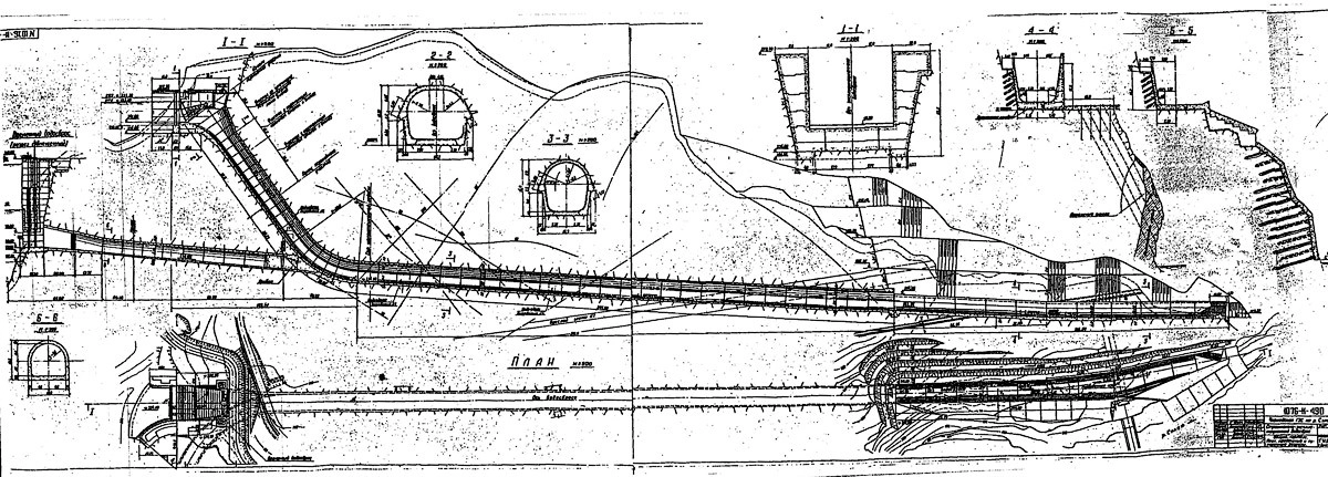 На месте возникло предположение, что это временный водосброс, когда один гидроагрегат был введен в эксплуатацию на пониженном уровень воды.