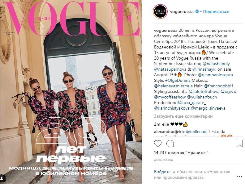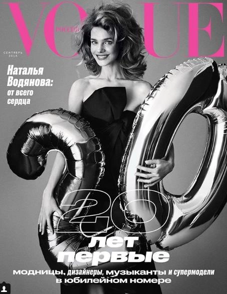 Журналу о моде «Vogue Россия» исполняется 20 лет. Обложку сентябрьского юбилейного выпуска украсят российские модели: Наташа Поли, Ирина Шейк и Наталья Водянова.