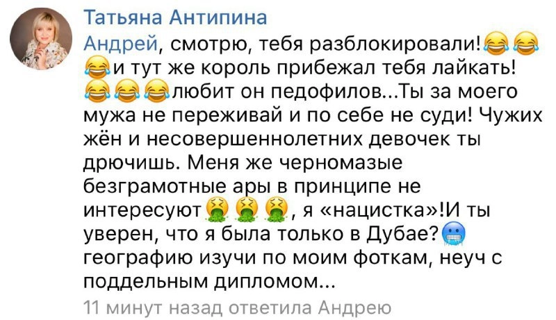 Скандальное заявление было сделано Антипиной в пылу спора с неким Андреем.