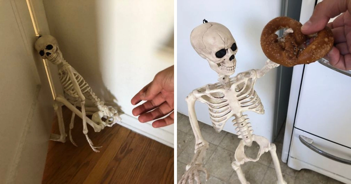 На снимках комик снял скелета в позах, напоминающих позы бездомной собаки, которую привели в дом.