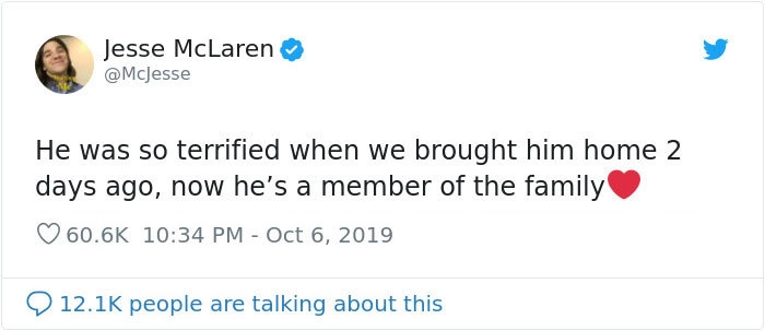Он был так испуган, когда мы привели его домой два дня назад, но теперь он член семьи.