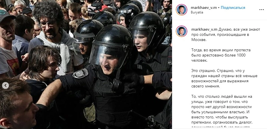 Член Совета Федерации РФ от Иркутской области Вячеслав Мархаев выступил в Сети с осуждением действий московского ОМОНа на митингах, прошедших в столице в поддержку независимых кандидатов в Мосгордуму.