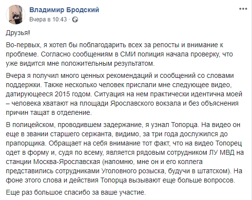 «Мне предложили пройти в отделение полиции „для проверки по компьютеру“. Ответа на вопрос, является ли это задержанием, я в очередной раз не получил… В отделении я быстро понял, что никакой „проверки по компьютеру“ не будет — меня привели в подвальное помещение и закрыли дверь на замок. Далее сотрудники уже в куда более грубой и угрожающей манере потребовали меня вынуть из карманов личные вещи. В ответ я потребовал участия понятых и составления протокола досмотра. Топорец [один из полицейских] и второй сотрудник заявили, что есть два варианта — „по-хорошему“ (без протокола) и „по-плохому“», — написал Бродский.
