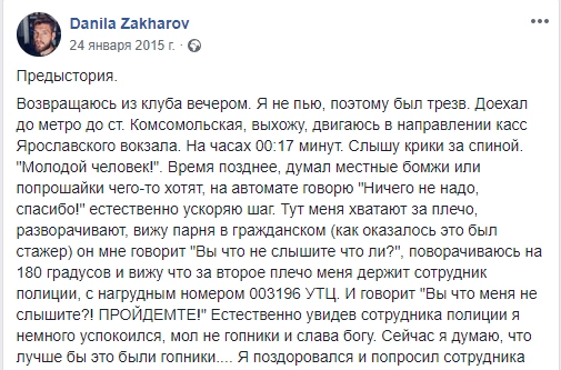 Похожую историю два года назад рассказывал в Facebook москвич Данила Захаров. Полицейские тоже подошли к нему на Комсомольской площади.