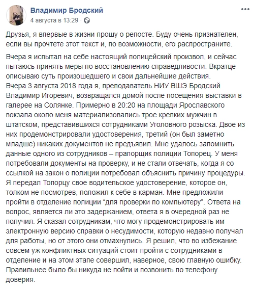 3 августа полицейские задержали преподавателя Высшей школы экономики Владимира Бродского. Сотрудники правоохранительных органов отказывались назвать причину задержания и обращались с мужчиной очень грубо.