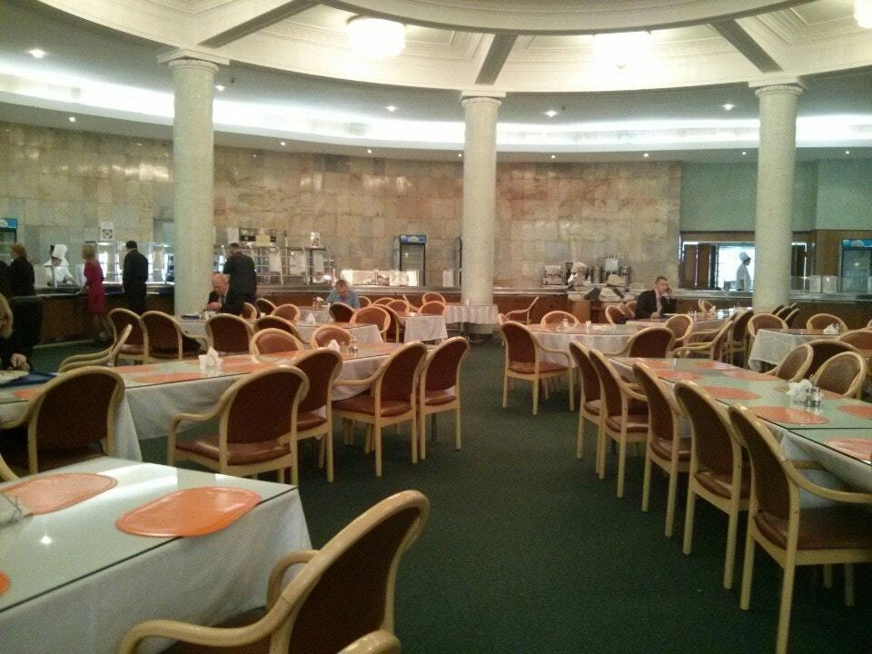 В Госдуме два обеденных зала: «золотой» для депутатов и «зеленый» для гостей. По меню и ценам залы практически не отличаются. В каждом из них самообслуживание с подносами, как в обычных недорогих городских столовых.