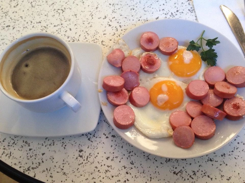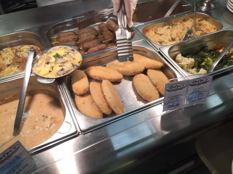 В буфете можно не только выпить чай-кофе и съесть пирожное, но и выбрать блинчики, сырники, кашу, салатики, сосиски, яичницу. Своего рода завтрак целый день, но без особых изысков.