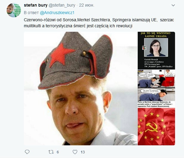 Под этой записью в Twitter польские пользователи начали постить изображение лидера «Современной» Рышарда Петру в буденовке.